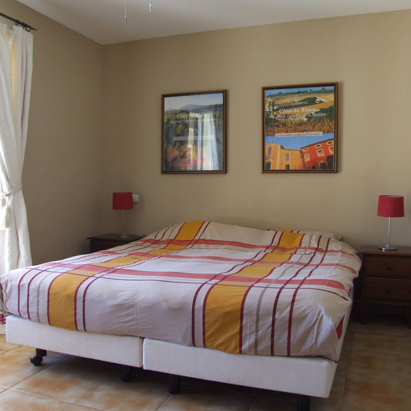 Er zijn 4 ruime slaapkamers met elk twee boxsprings te gebruiken als één tweepersoonsbed of twee eenpersoonsbedden. In de garage staan nog twee opklapbare bedden. De slaapkamer op de bovenverdieping is de masterbedroom en beschikt over airconditioning, een bureau, open haard en een balkon. De deuren van de slaapkamers 3 en 4 (linksvoor) en de dubbeldeuren van de woonkamer (rechtsvoor) komen allemaal uit op het grote terras aan de voorzijde.
